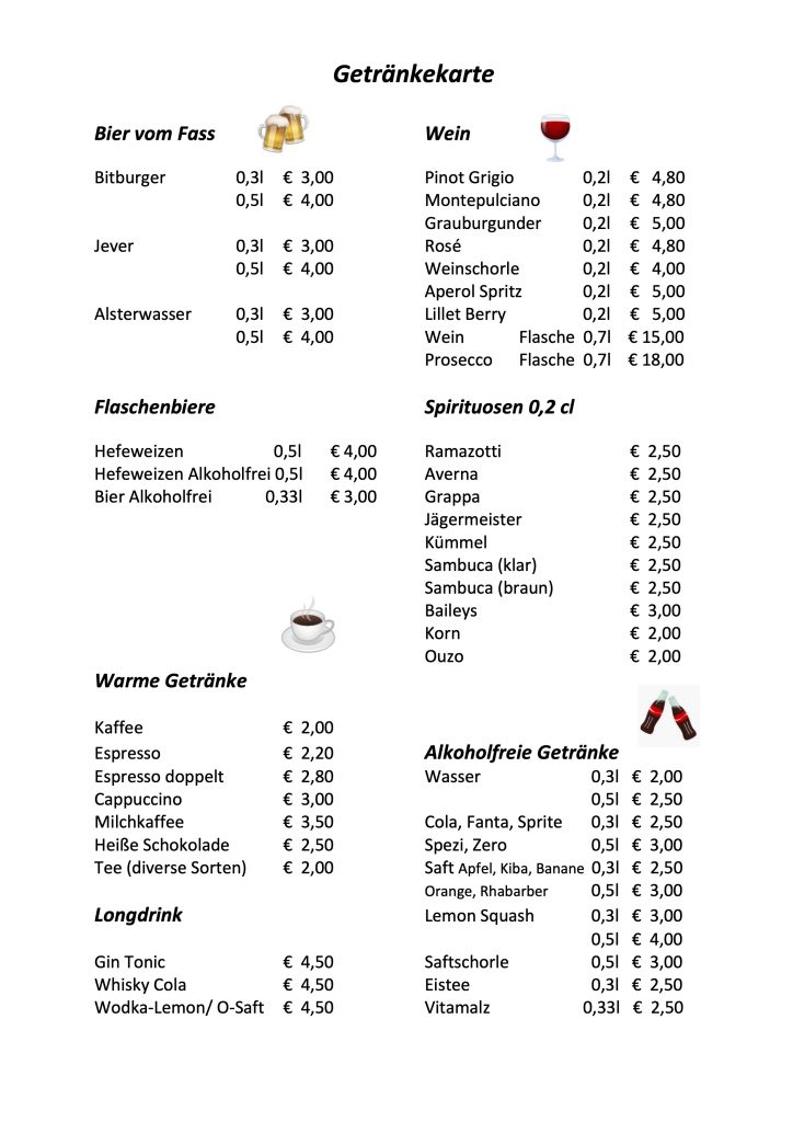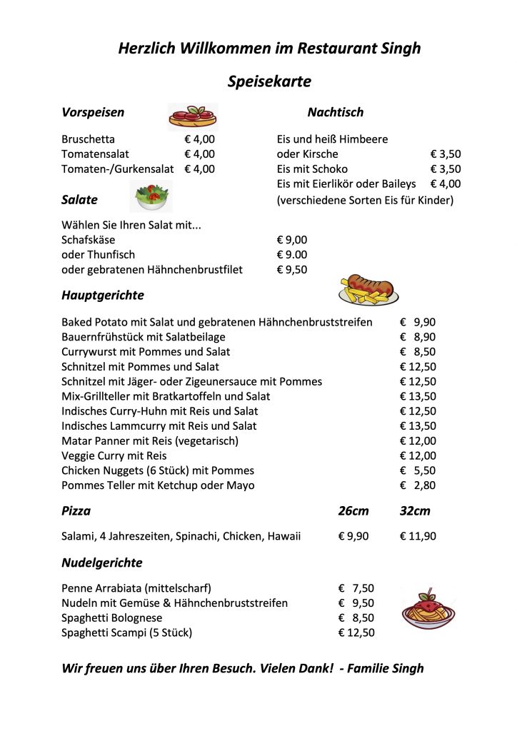 Unser Clubwirt Narinjan Singh sorgt für das leibliche Wohl unserer Mitglieder und Gäste. Die Öffnungszeiten sind von 16:30 Uhr bis 22:00 Uhr. Die Speisekarte findet ihr hier unten auf der Seite.